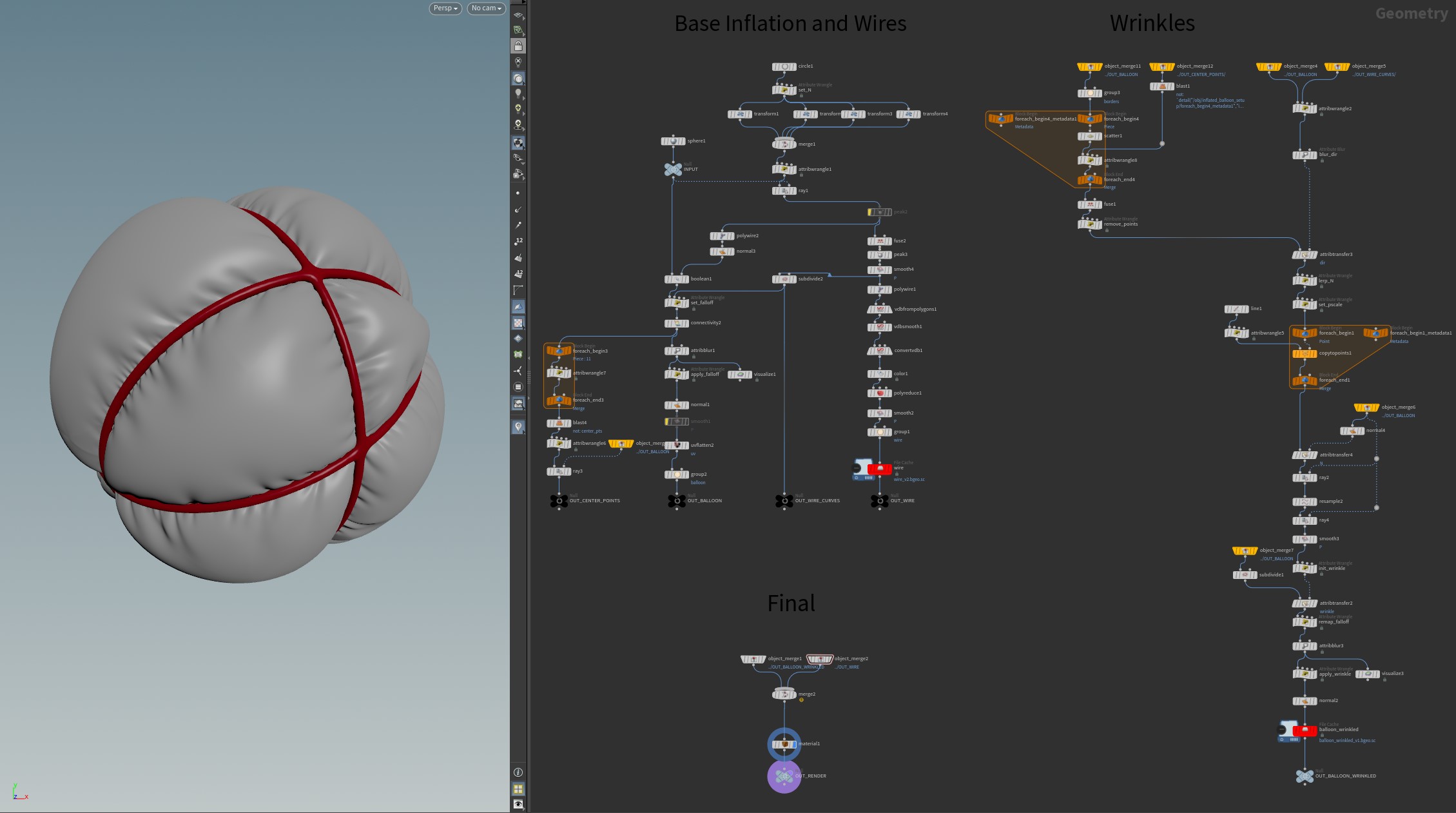 The project started as a super quick exercise to create the inflated shapes procedurally in Houdini, including all of the inflation effect, the wrinkles, and the wire cage. The aim was to make it look as good as it should, were it sculpted in Zbrush.